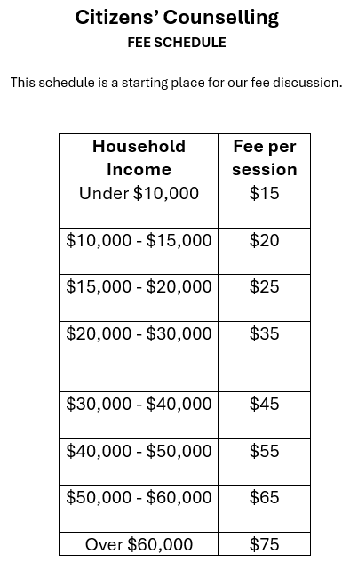 The Citizens’ Counselling Centre has a sliding fee scale based on family / household income.